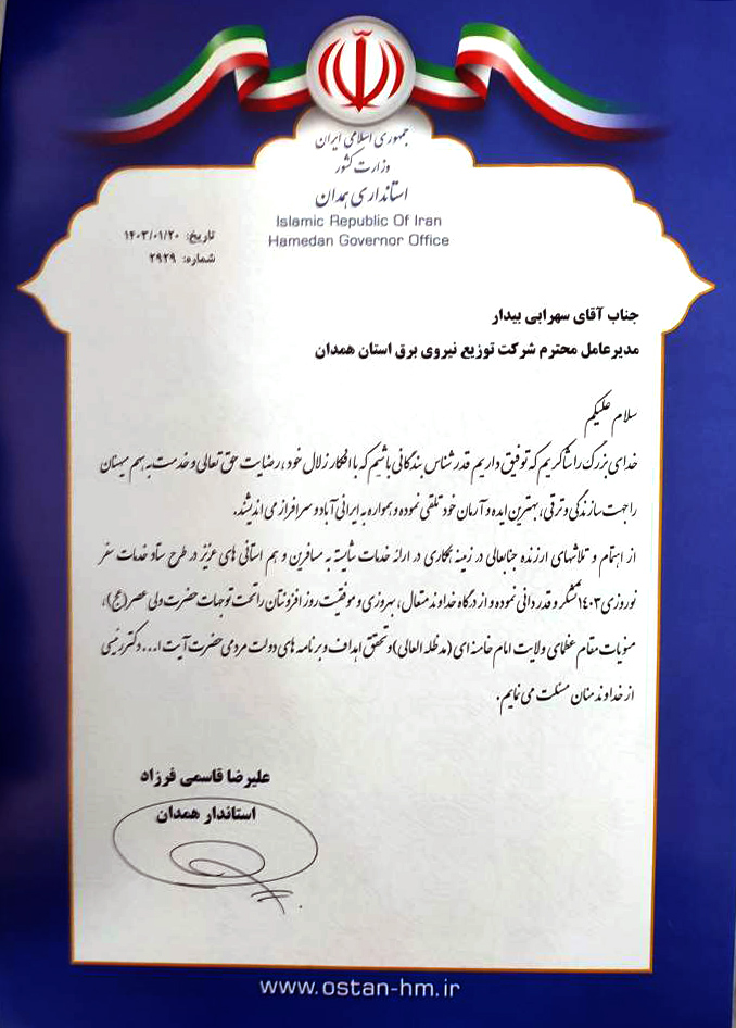 روابط عمومی شرکت توزیع نیروی برق استان همدان در بخش شرکتهای خدماترسان ارزیابی عملکرد روابط عمومیهای دستگاههای اجرایی استان همدان در سال ۱۴۰۲، حائز رتبه اول شد. 1403/2/28 17:10:40