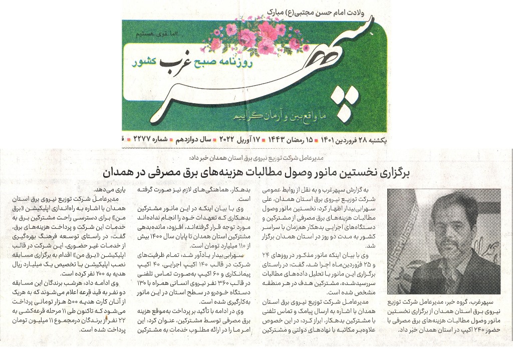 شرکت سهامي مديريت توليد، انتقال و توزيع نيروي برق ايران © کلیه حق و حقوق مادی و معنوی این سایت، متعلق به شرکت توزیع نیروی برق همدان می باشد.