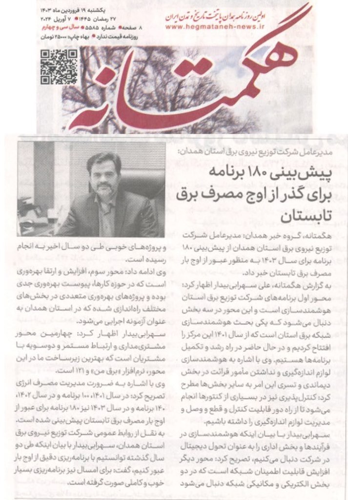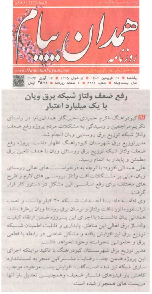 شرکت سهامي مديريت توليد، انتقال و توزيع نيروي برق ايران © کلیه حق و حقوق مادی و معنوی این سایت، متعلق به شرکت توزیع نیروی برق همدان می باشد.