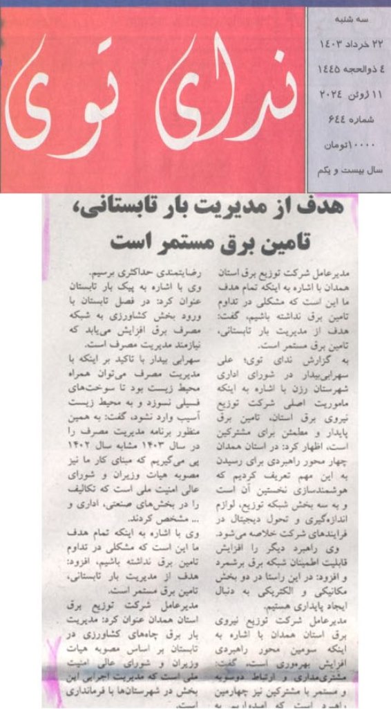 شرکت سهامي مديريت توليد، انتقال و توزيع نيروي برق ايران © کلیه حق و حقوق مادی و معنوی این سایت، متعلق به شرکت توزیع نیروی برق همدان می باشد.